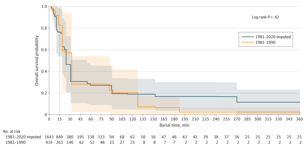 Kumulativ sannsynlighet for overlevelse basert på tid begravd under snøskred i minutter fra Rauch et al. (2024). Den mørkeblå linjen representerer nye data fra 1981 til 2020, med manglende tider imputert; den oransje linjen, data fra 1981 til 1990 som brukt i studien av Falk et al. (1994) med manglende tider imputert; vertikal stiplet linje, 15-minutters referansepunkt.